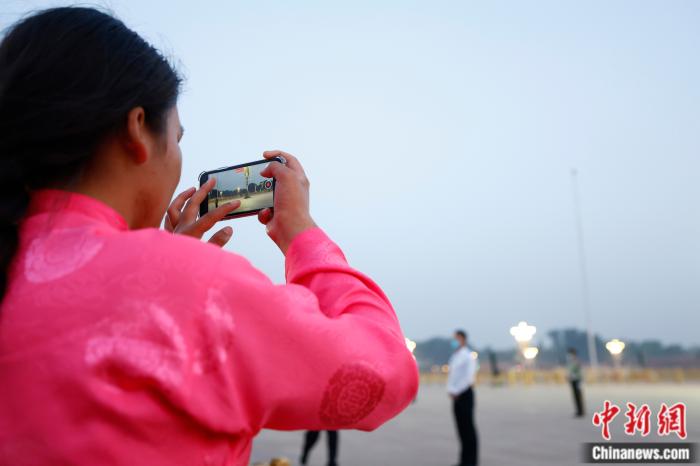 “六一”儿童节一早,来自青海省玉树藏族自治州儿童福利院的部分藏族青少年在天安门广场观看升旗仪式。图为闹增拉毛在拍摄五星红旗。中新社 富田 摄